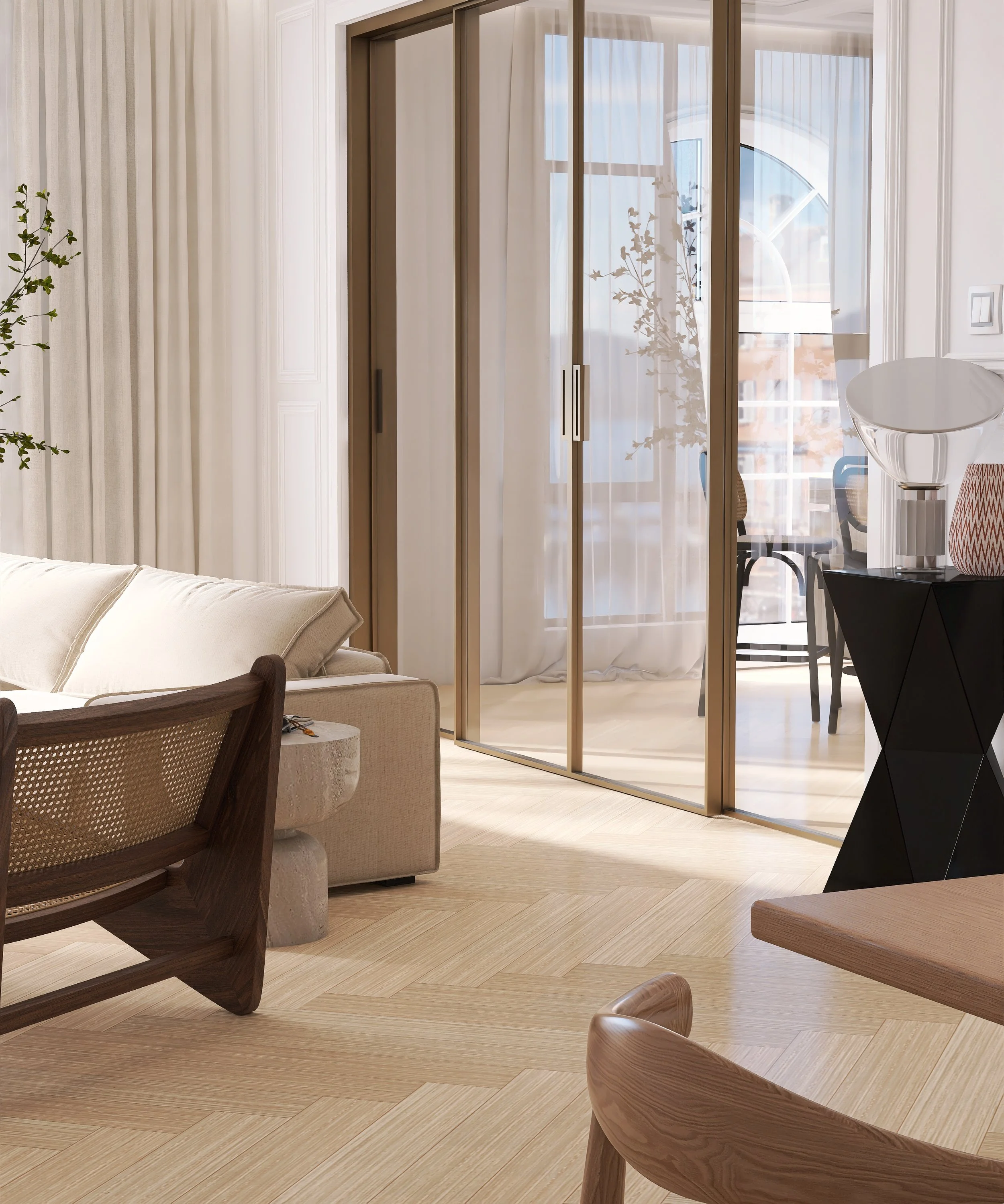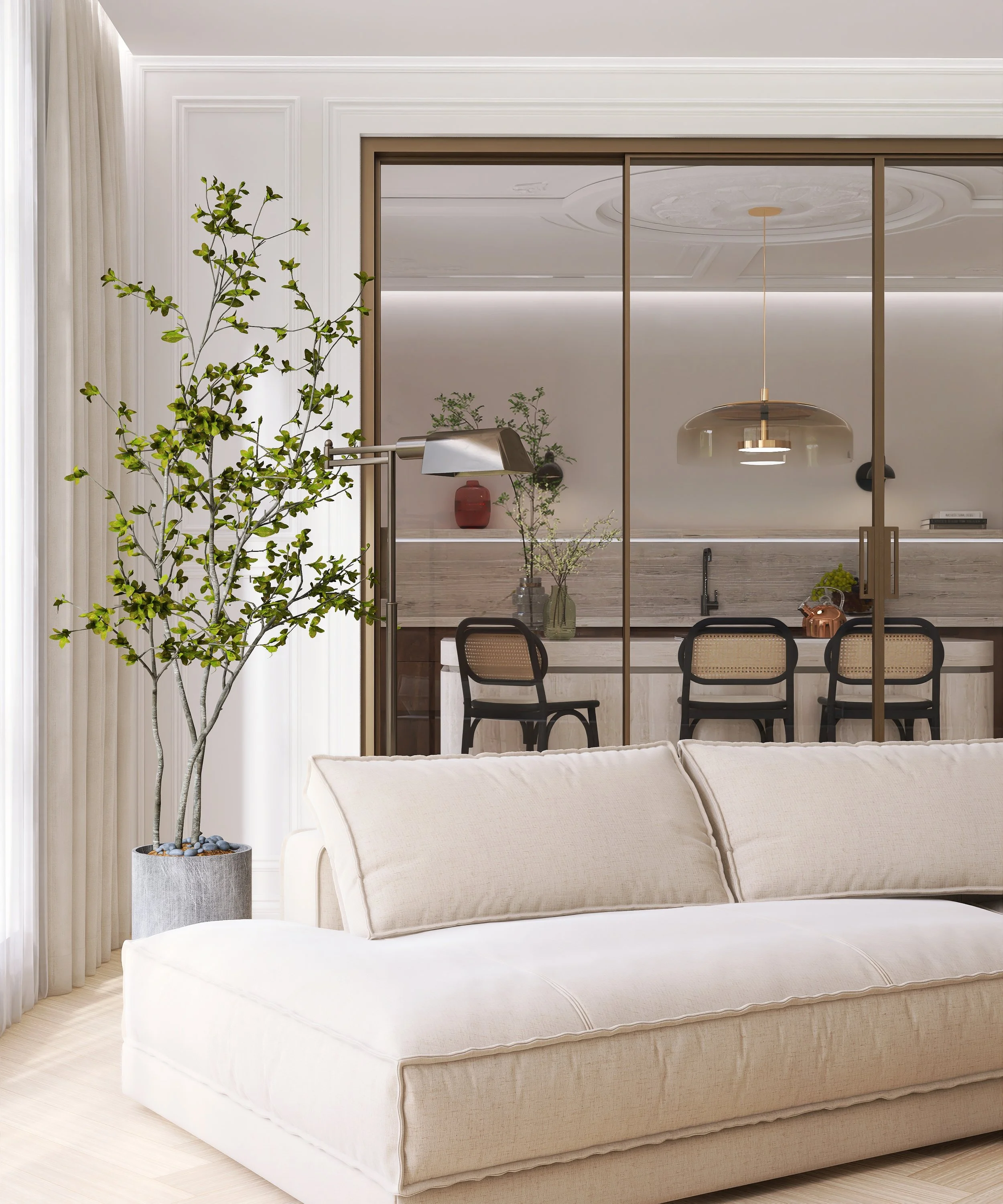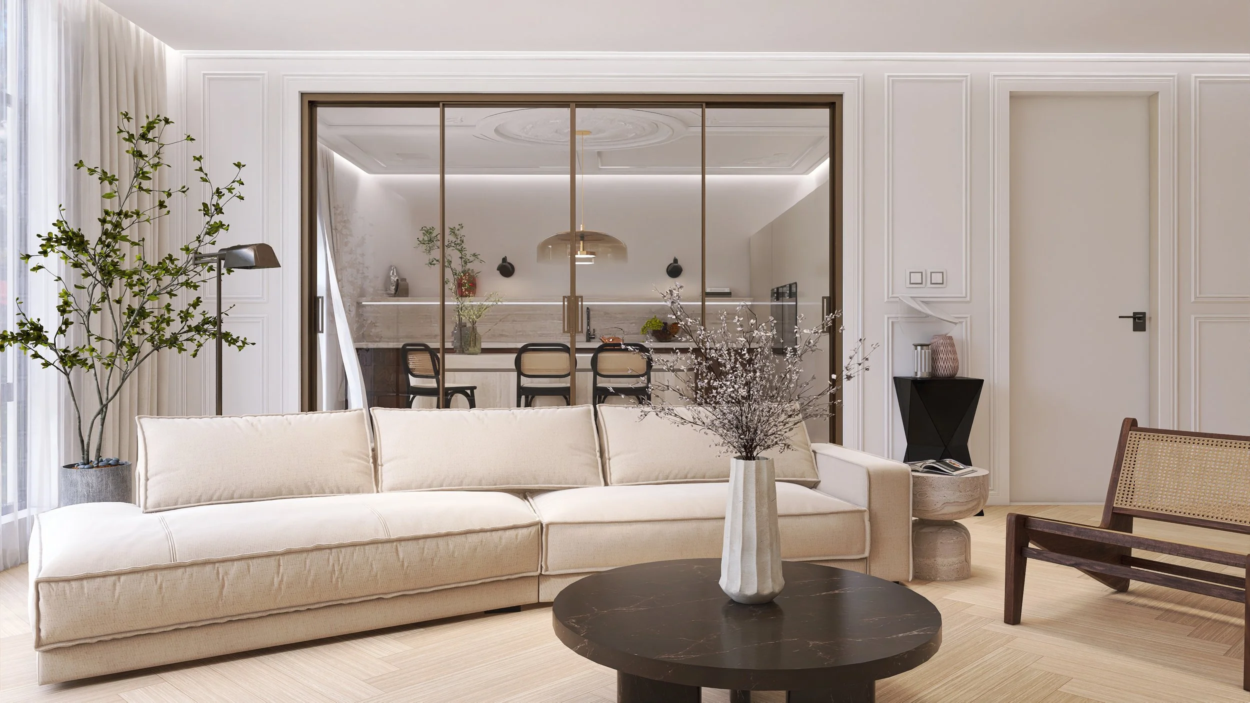Glass sliding doors connect the kitchen and living area into a rhythmic whole, while travertine, oak, and neutral textiles bridge classical elements with modern needs.