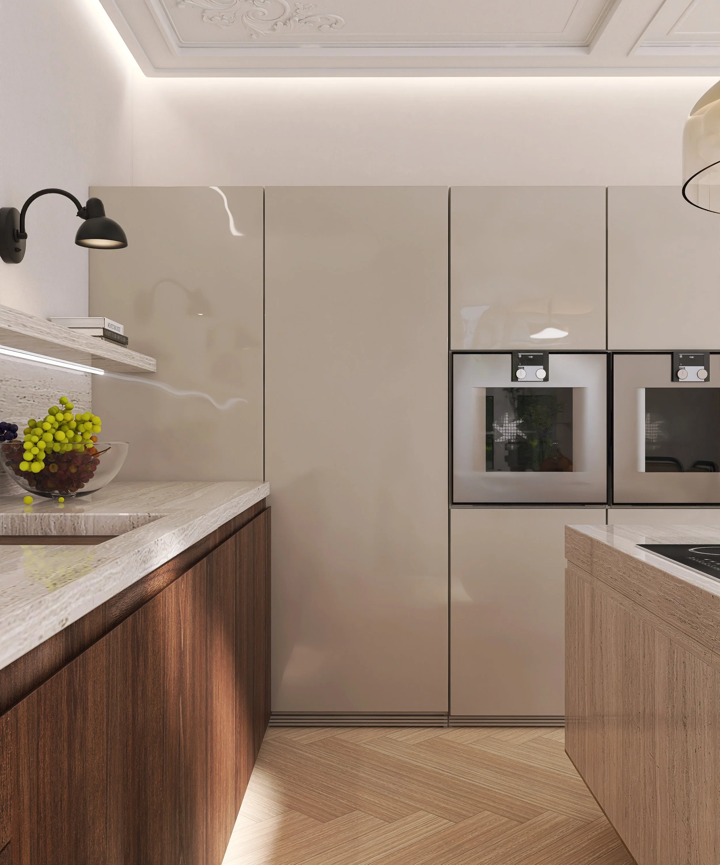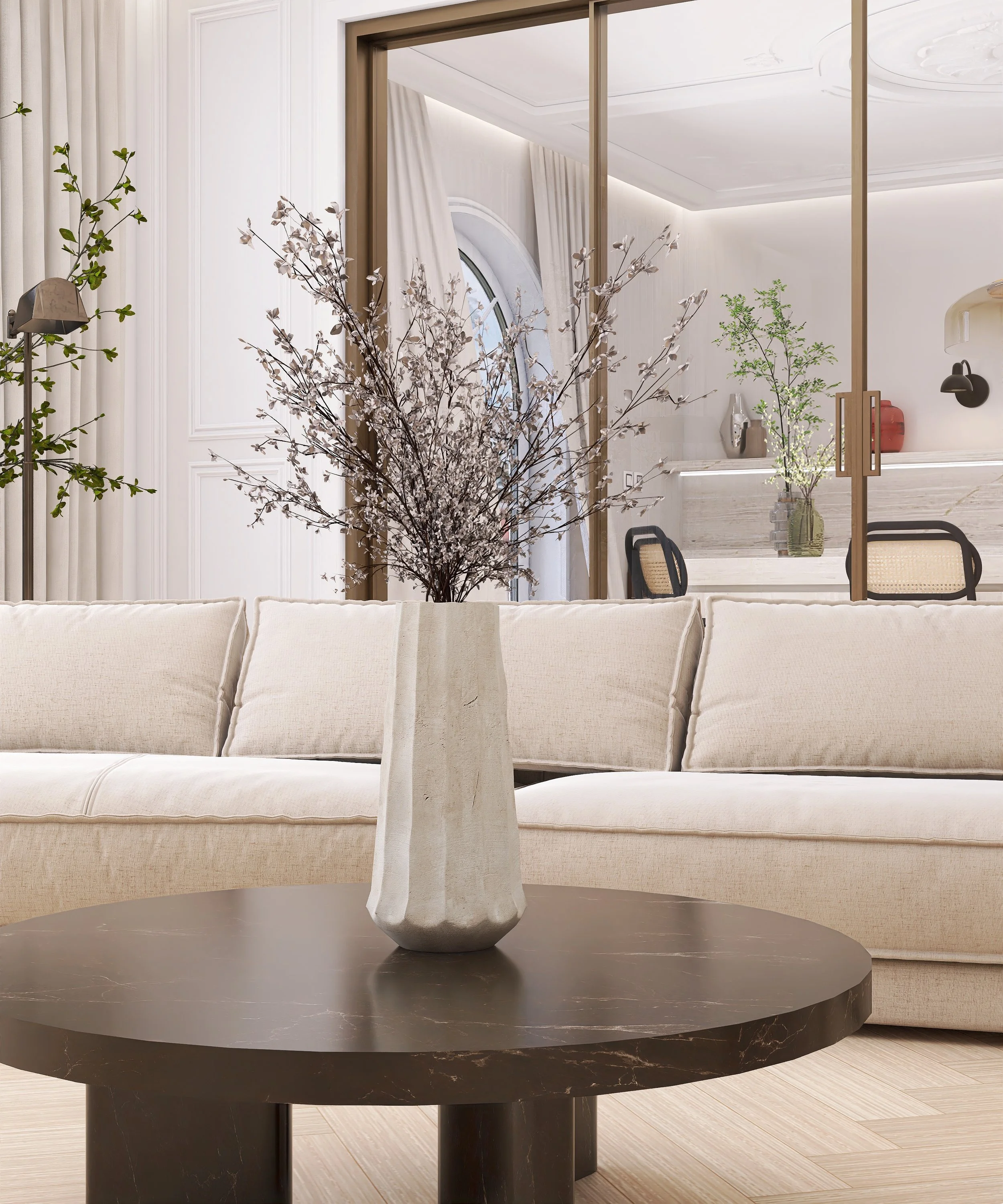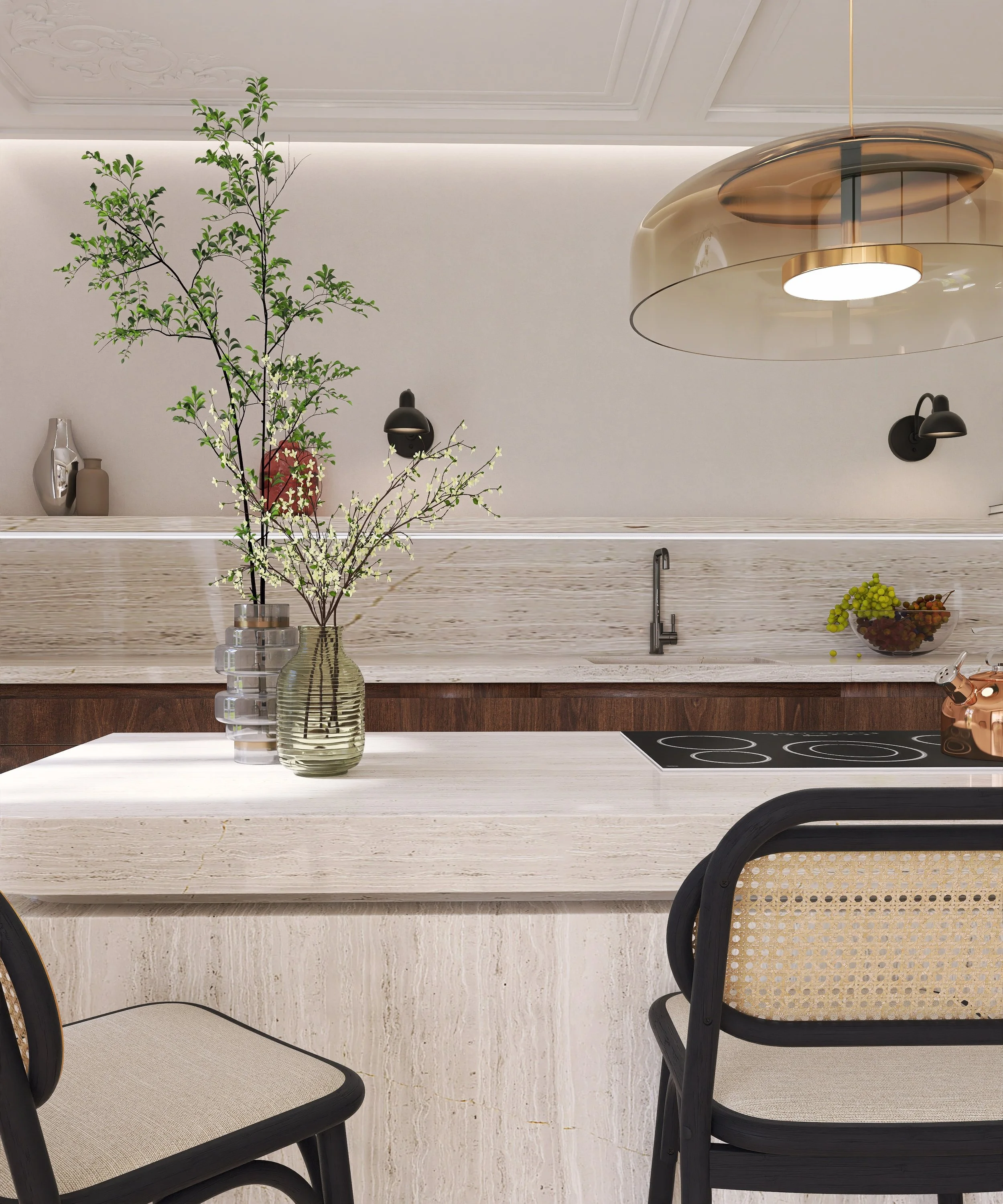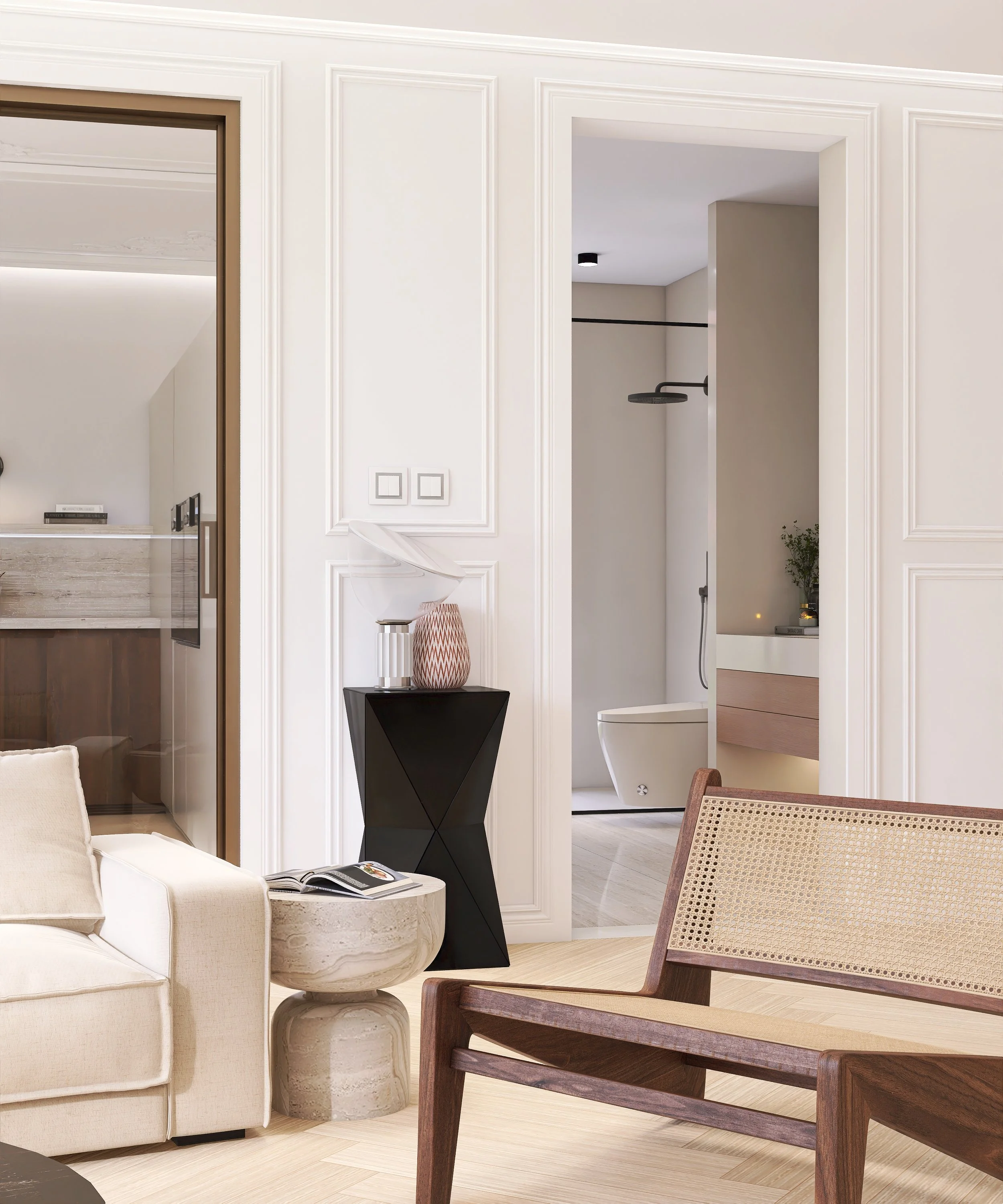 Glass sliding doors connect the kitchen and living area into a rhythmic whole, while travertine, oak, and neutral textiles bridge classical elements with modern needs.
